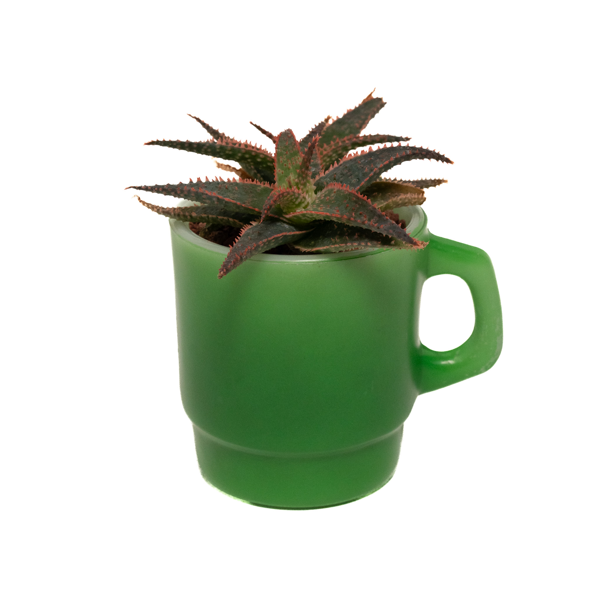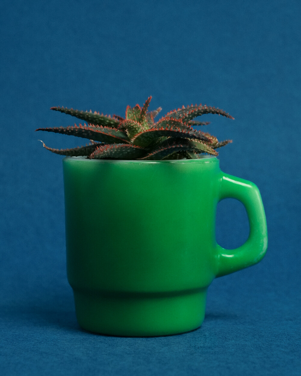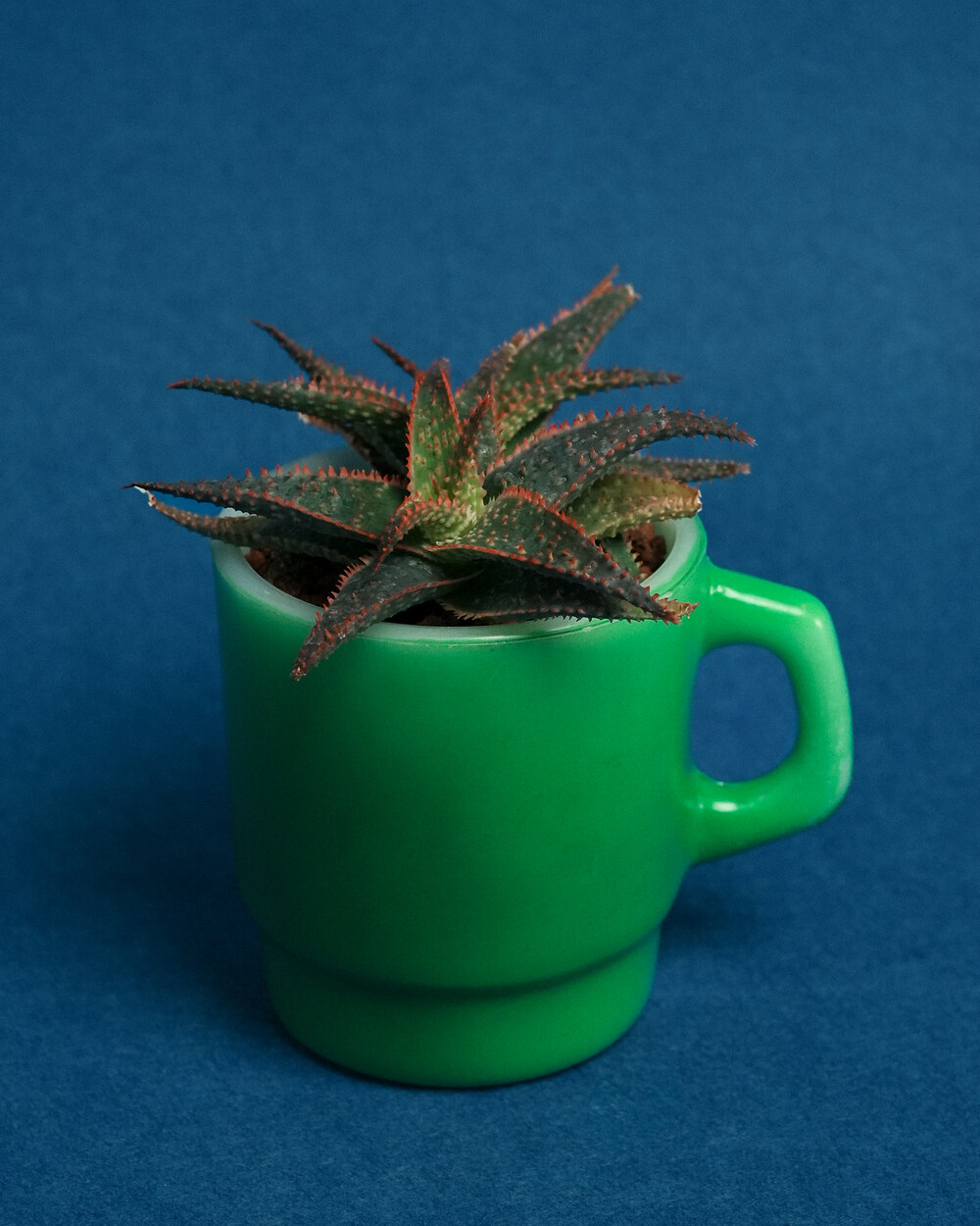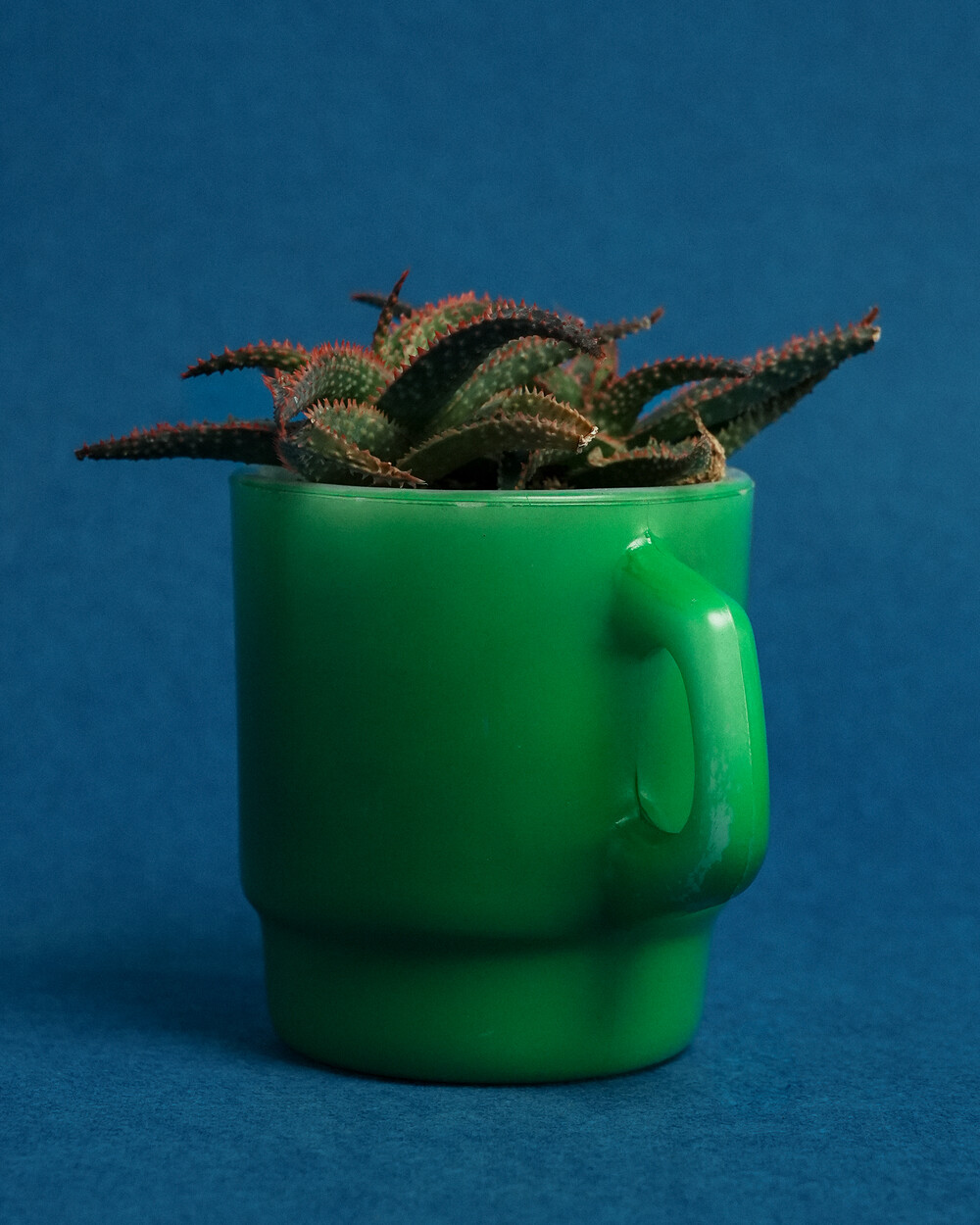 미국의 유리 제조사인 Anchor Hocking 사의 Fire-King Mug는 1940년대부터 70년대까지 생산되었으며, 미국 가정과 식당에서 흔히 쓰이던 제품입니다. Vintage Fire-King Mug에 식물을 담았습니다.